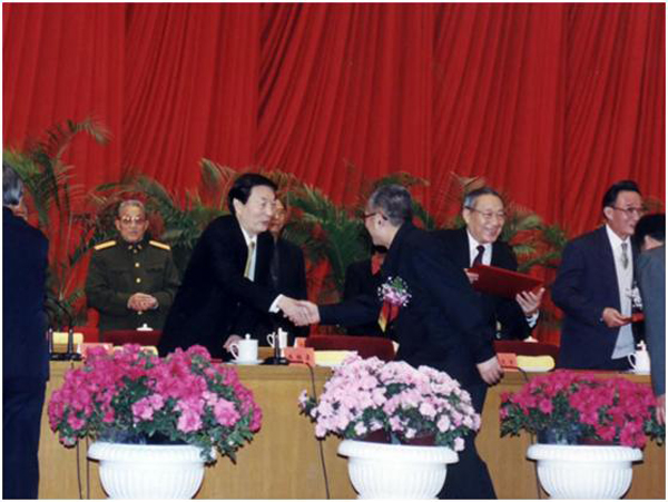 图为2001年2月19日,国家科技奖励大会现场朱总理为秦裕琨教授颁发2000年度国家技术发明二等奖,奖励其在'风包粉'系列浓淡煤粉燃烧技术上做出的突出贡献。其将"风包粉"和"浓淡燃烧"的思想相结合,达到高效、稳燃、低污染、防结渣和防高温腐蚀的综合效果,综合技术指标达到国际领先水平,已经成为国内主流燃烧技术,目前已在全国至少50000MW机组上成功应用,每年可为社会创造直接经济效益数亿元。秦裕琨教授1956年毕业于里番 锅炉制造专业研究生班,毕业后留校任教,历任哈工大热能工程教研室主任、动力工程系主任兼党总支书记、汽车工程学院院长、哈工大副校长等职务,于2001年当选为中国工程院院士。