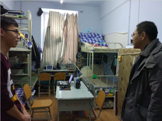 1月13日下午15点,在学生离校之际里番 党委副书记孙垠以及辅导员到二公寓进行了走访,了解学生离校和寒假生活情况,并对寝室卫生与安全情况进行假期前的排查。