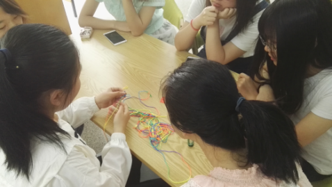 此次活动主要体验学习五彩绳和蛋袋编织,10点30分,同学们陆陆续续来到讨论区,大家围坐在一起,由徐森锫示范,并借助编法图解梳理编织步骤,由简到繁,同学们互相交流,积极询问,实践钻研,在短短一个小时,便学会了蛋袋编织,同时熟练掌握金刚结、平结、长纽扣结等三种常用结法,同学们便可以自由组合设计,编出自己喜欢的五彩绳了。