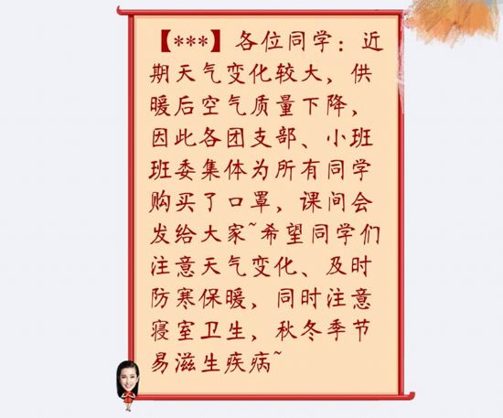 由于入秋以来天气情况多变,尤其在近日供暖后,同学们在早起出门后感觉不适、呼吸不畅。为了鼓励更多同学早起、自习,里番 2016级各团支部、小班班委经过商议,为全年级的每名同学购买医用口罩。10月11日早,各团支部、小班班委代表于第一节课前聚集在致知楼二楼大厅,统一进行分配,于课间下发给同学们。希望同学们能够在每一个清爽的早晨,以崭新的面貌和状态迎接十九大的到来。