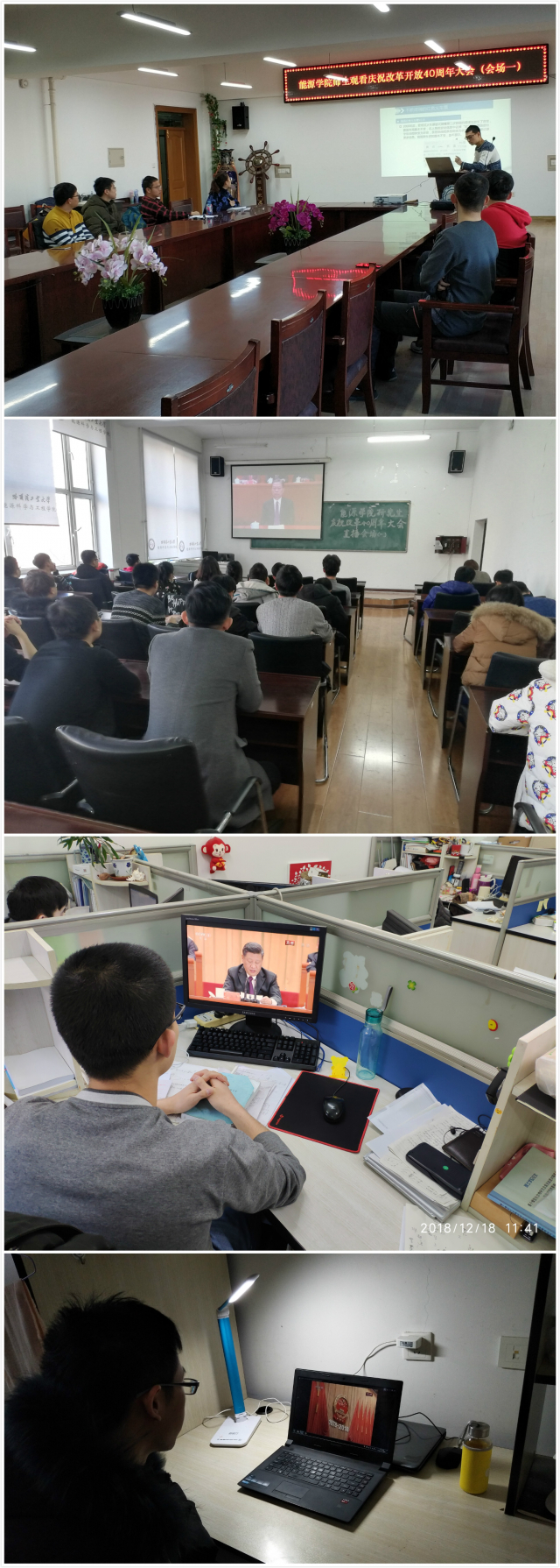 上午10时,庆祝改革开放40周年大会在人民大会堂举行,里番 学子在动力楼、节能楼、会议室、实验室、寝室各地进行了大会直播观看。首先一同致敬了为改革开放事业做出杰出贡献的各界人士,为他们颁发荣誉奖章时同学们自发响起了热烈的掌声,由衷地敬仰感谢这些改革的推动者、国之栋梁和人民英雄为今天美好生活做出的努力和牺牲。而后一同聆听总书记在大会上发表的重要讲话。总书记说“40年来取得的成就不是天上掉下来的,更不是别人恩赐施舍的,而是全党全国各族人民用勤劳、智慧、勇气干出来的!”,句句振奋人心,催人奋进。