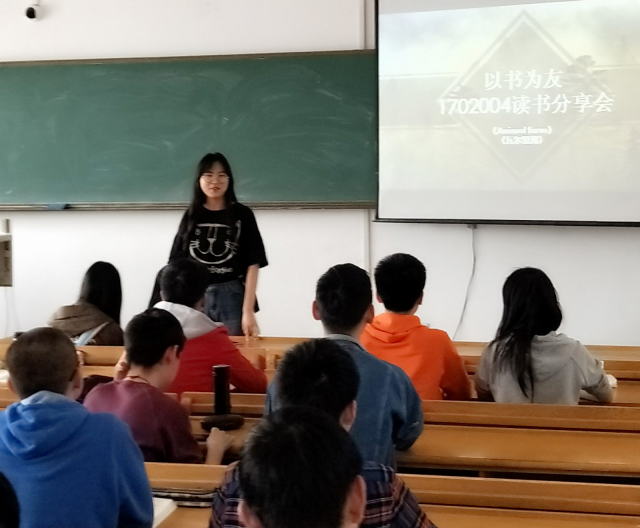 本次活动在由班长王雨柔主持,首先她向全班同学们推荐了一本英文名著——《动物庄园》。阅读纯英文小说能提高我们对于英语理解能力,同时,这部小说诙谐幽默,富含暗喻意味,作者对于民主政权的理解也是值得我们深思借鉴的。王晨同学也分享了一本极富哲理的书籍——《瓦尔登湖》,瓦尔登湖已不单是那一片湖,那些在生活中感悟真谛,追寻简单的人们梦中,都有不一样的“瓦尔登”。接着,同学们有的带着自己最近阅读的名著上台分享,有的在班级群里发送书籍链接。思想的碰撞和交流,让我们意识到知识海洋无限广阔,也坚定了读更多好书的决心。