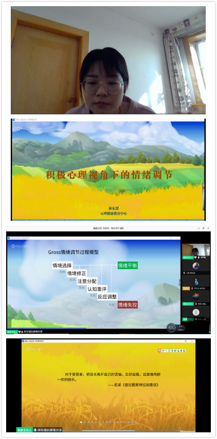 活动伊始,主持人宋悦泽同学对林老师进行了简要介绍。林老师首先总结了疫情期间所产生的消极情绪,教大家如何分辨理性情绪和非理性情绪,并分析了情绪产生的原因。接下来林老师就Gross情绪调节过程模型,结合图片分析不同情绪给大家讲解了如何调整情绪。同学们在林老师的引导下不仅学会了如何分析情绪,更学会了分析情绪以后如何进行调节。