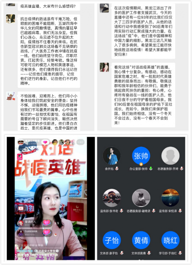 团委组织同学借助腾讯会议转播抖音黑龙江共青团“对话抗疫英雄”节目,并利用腾讯会议聊天区进行讨论。