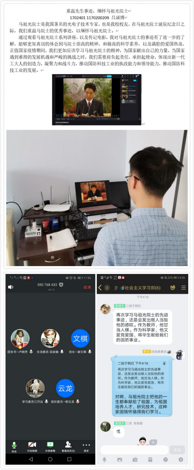 如果说“规格严格,功夫到家”的校训是每位工大学子做人治学求是的准则,那么马祖光院士身上所具有的精神则是催人奋进的宝贵财富。在接到活动通知后,各年级团支部的团干部主动利用周末的时间认真学习了缅怀马祖光院士的系列推送,并观看《马祖光先进事迹报告会》、《一位科学家的24小时》等视频。每位团干部都被马祖光院士的伟大人格力量深深打动,并以学习感悟的形式记录自己的收获,将这份马祖光院士带给哈工大学子的宝贵精神财富加以珍藏。