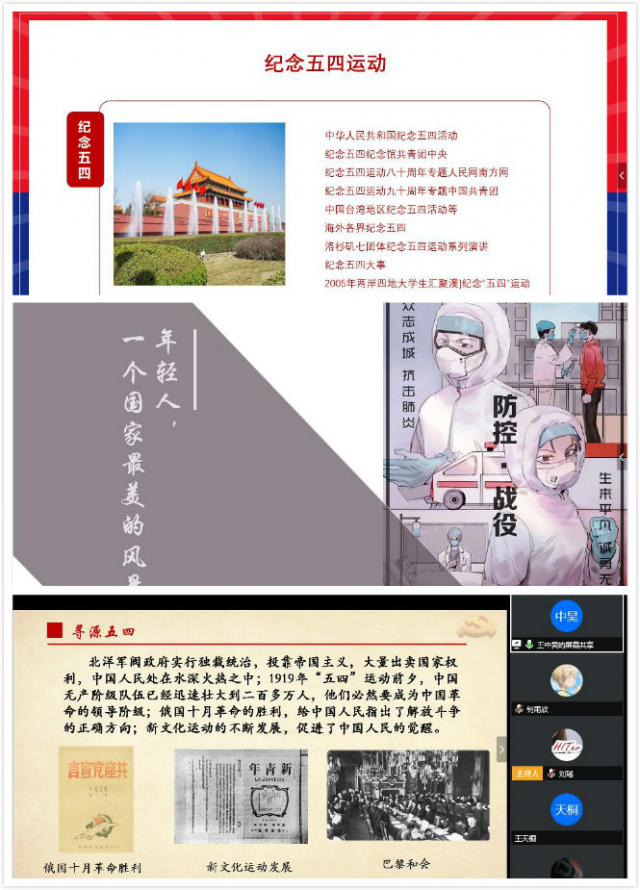 由于疫情的影响,本次五四纪念活动在线上举行,来自党支部的五名优秀预备党员向大家分享了他们心中的五四,在支部成员分享的一个个故事中,弘扬和传承“爱国、进步、民主、科学”的五四精神成为最核心的命题。无论是在那个遥远的年代,还是我们现在所处的疫情中,正是着一群群充满热血,怀抱希望的年轻人引领着中国前进的步伐,在大家慷慨激昂的演说中无不寄托着同学们对万众一心抗击疫情必胜的决心,以及对工大即将迎来百年华诞的真诚祝愿和对国家的赤诚热爱。