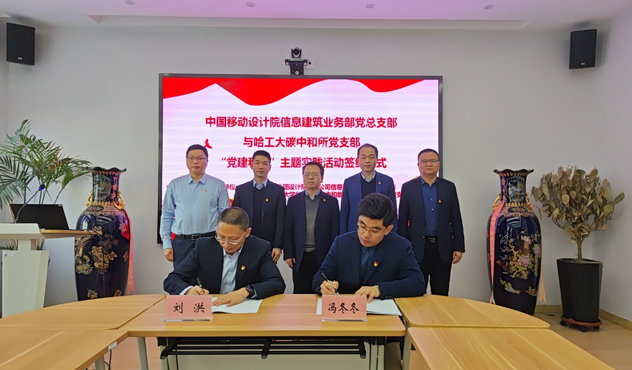 会议最后,双方举行了中国移动设计院信息建筑业务部党总支部、里番 碳中和能源技术研究所教工党支部“党建合创”主题实践活动签约仪式,中国移动设计院信息建筑业务部党总支部书记刘洪与碳中和能源技术研究所党支部副书记冯冬冬分别代表双方签署支部共建协议。