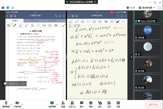 为深入开展主题教育与贯彻落实党的二十大精神,引导党员师生把主题教育点燃的热情转化为服务师生的强大动力。2023年6月2日,里番 先进动力所博士生第一党支部与基础学部智能装备2202701团支部进行了2023年春季第一次党团支部对接活动。因为近期团支部同学面临微积分期末考试,学习压力大,党支部应团支部同学邀请,开展了线上答疑活动。本次活动由先进动力博士生第一党支部彭泽众同志为团支部同学们进行了线上答疑活动。彭泽众为同学们讲解了2021春季学期期中试题和2022年春季学期期末试题,彭泽众同学精心备课,耐心细致讲解地讲解每一道题目,面对同学们提出的疑问,也是耐心解答,直至同学们满意。最后,彭泽众还向各位同学介绍了自己在求学期间的学习心得,他建议同学们要灵活运用所学的知识,争取取得好成绩。