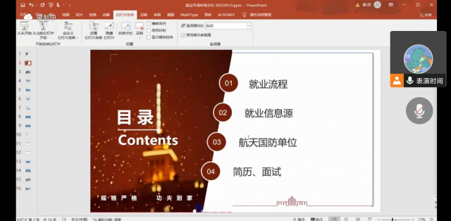 针对当前就业形势,结合各位同学自身实际情况,邱燚从就业流程、就业信息源、航天国防单位介绍以及简历设计与面试等四个方面为同学们开展就业专项指导。会议伊始,邱燚梳理了毕业基本要求,整理了就业相关流程,建议大家提前做好规划与准备,并提醒同学们甄别各种就业信息来源;随后,邱燚介绍了近几年里番 毕业生就业方向,着重介绍了各个航天国防单位,建议同学们在选择未来方向时要结合当前客观实际与个人意愿,避免盲从,认真分析后再做出选择,同时欢迎同学们积极向各位老师咨询了解;最后,邱燚为同学们介绍了简历撰写的基本规范,根据前期收集的同学们的简历进行针对性的分析说明,并结合职场礼仪常识为各位同学如何应对面试提供了建议。