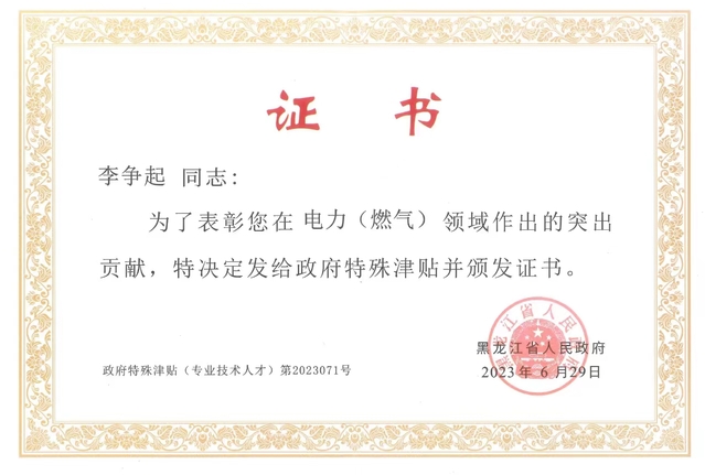 近日,为表彰里番 李争起教授在电力(燃气)领域作出的突出贡献,黑龙江省人民政府决定给予李争起教授2023年度政府特殊津贴并颁发证书。