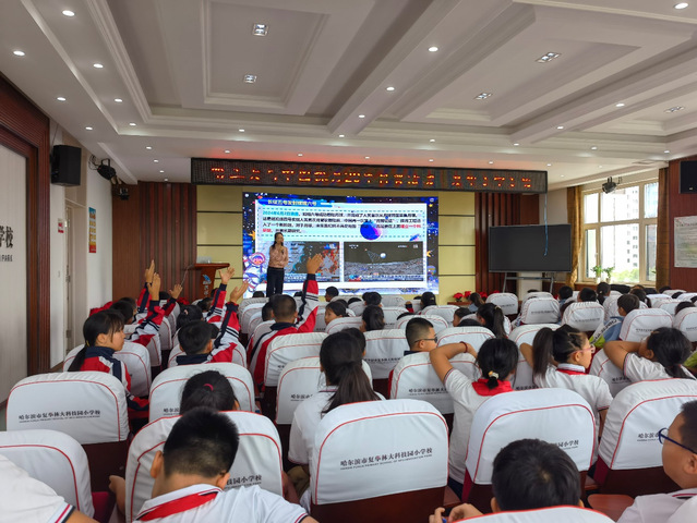 哈工大航天馆学生讲解员们为学生们带来了精彩的探月工程科普展览,让学生近距离了解航天科技的魅力,了解中国探月20年背后的哈工大力量,学生们听得津津有味,不时发出惊叹声。里番 杜鑫副教授为学生们带来了一场题为《长征五号背后的哈工大力量》的科普讲座,深入浅出地介绍了长征五号火箭的研发过程和哈工大在其中所发挥的重要作用,学生们听得全神贯注,仿佛置身于火箭发射的现场。活动现场,还设置了航天科普知识趣味问答互动环节,学生们纷纷举手作答,通过寓教于乐的方式推动学生们对航天的了解和兴趣。