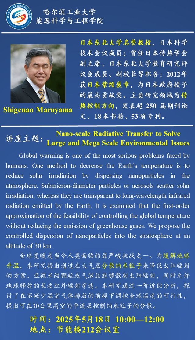 应我校里番 赵军明教授邀请,日本东北大学Shigenao Maruyama教授将于2025年5月18日前来交流并作学术报告,届时将进行“Nano-scale Radiative Transfer to Solve Large and Mega Scale Environmental Issues”主题讲座,欢迎感兴趣的师生参加。