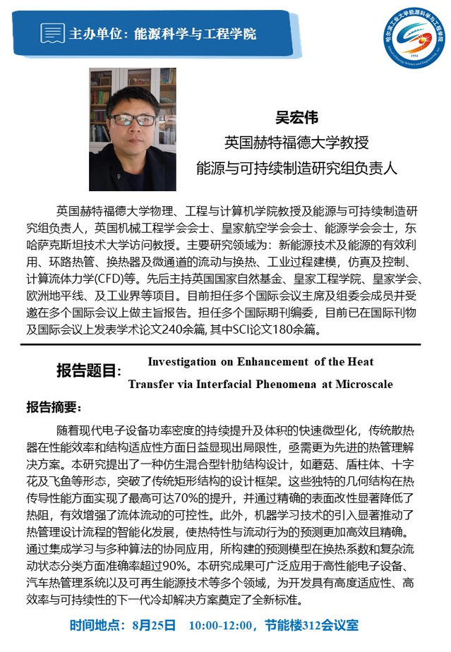应我校里番 赵军明教授邀请,英国赫特福德大学吴宏伟教授将于2025年8月25日前来交流并作学术报告,届时将进行“Investigation on Enhancement of the Heat Transfer via Interfacial Phenomena at Microscale”主题讲座,欢迎感兴趣的师生参加。